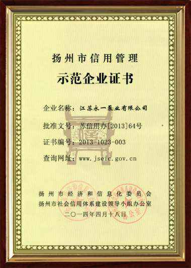 扬州市信用管理示范企业证书