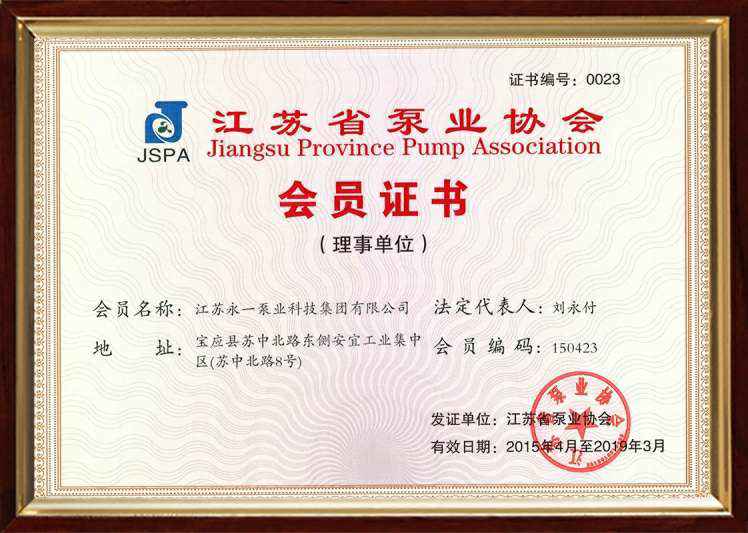 江苏省泵业协会会员证书